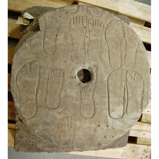 The inscription it may be from a gymnasium or a sanctuary. On the stone there carved pairs of feet with names of different people: the devotees of the relief or the winners of an athletic competition? The inscription was at some point cut out and re-used as a different object, perhaps a pillar and that is why it has a whole in the middle.