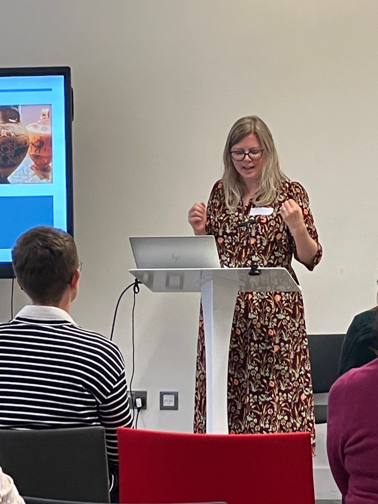 The next panel kicked off with a talk from Judith Hewitt called ‘Dumfries Museum: Far away lands, local collectors’, giving an overview of projects relating to Ancient Egyptian and East Asian collections. She pointed to how similar approaches might be applied to classical collections, to investigate how collections from Cyprus came to Scotland. and showed how exploring these histories can offer tangible connections to colonialism that can build a more outward-looking approach to local histories. Alison Hadfield gave a talk about how the University of St Andrews collection of objects from Cyprus is used in teaching and outreach, including the Through a Glass Darkly project. Christina Donald provided an introduction to the Classical collections in The McManus: Dundee’s Art Gallery and Museum, which include vases attributed to the collections of Thomas Hope and William Hamilton. Abigail Allan shared her work on Greek vases and other archaeological material in National Trust collections, which is now moving on to collections held by the National Trust of Scotland, and the value of such material for researchers. Finally, Anna Reeve presented on her research on the Ancient Mediterranean collections at Summerlee Museum.